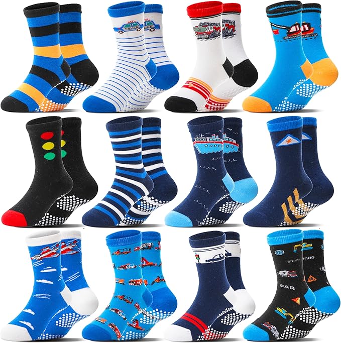 Baby Boys Grips Socks 12 Pairs Kids Toddlers Infants Anti Slip Non Skid Funny Cartoon Crew Breathable Cotton Socks
