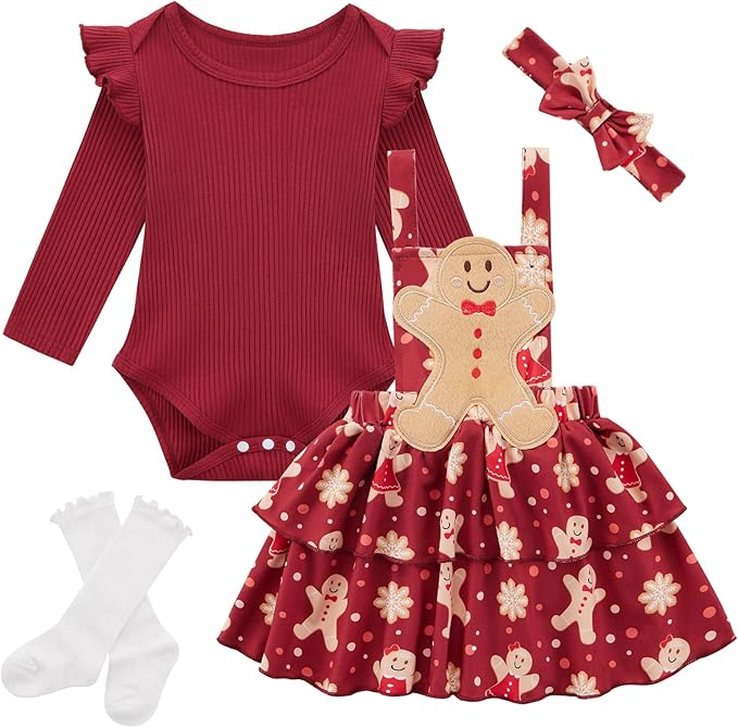 Newborn Baby Girl Christmas Thanksgiving Outfit 4 Pcs Long Sleeve Romper + Suspender Skirt + Headband + Socks