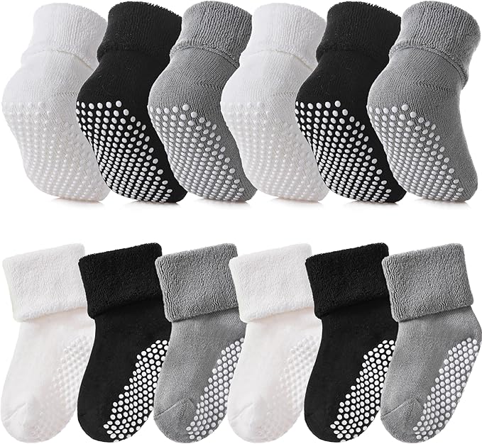 6 Pairs Toddlers Non Slip Socks with Grippers Baby Girls Boys Anti Skid Crew Cotton Socks for Infants Kids Gifts Baby